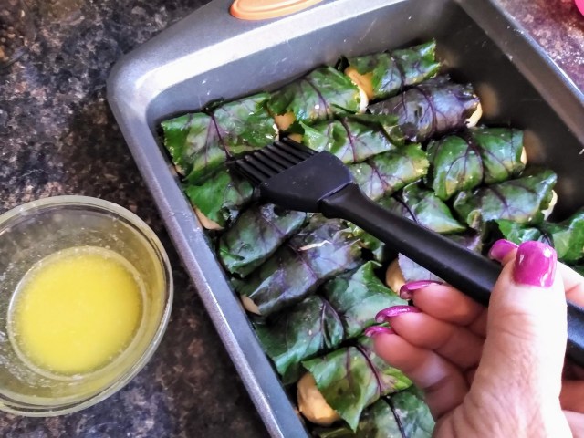 Melt a couple of Tbs butter in the pan while you’re preheating the oven for the second rising. Place a layer of leaves in the bottom of the pan and lay the wrapped dumplings on top. Leave some room in between. (I should have left more). Brush them with melted butter, add another layer of leaves and more melted butter. This last layer can also be added after rising and before baking. Cover with the damp towel and put back in the warm place for about an hour to rise again.