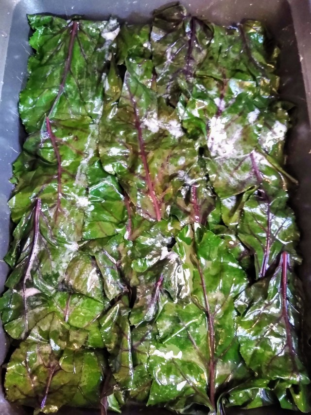 When the dough has doubled in size, punch it down and knead it for a minute or so, adding flour to prevent it from sticking to your hands. Separate into 24 pieces, a bit bigger than a golf ball and roll into an oval shape. Roll them loosely inside the beet leaves. Remember, they need some room to rise.