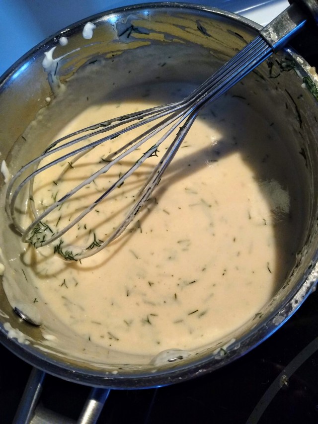 Remove the pan from the oven and preheat it to 350. Cover the pan tightly with foil and bake for 45 minutes. While they are baking, make the dill sauce. Make a roux with 2 Tbs. each butter and flour. Slowly add 1 c. chicken broth while whisking. Bring to simmering. Put the 3/4 c sour cream in a bowl and temper it with a little bit of the broth. Add it back into the thickened broth, turn the heat to low and stir in 3 Tbs. chopped fresh dill weed and salt and pepper to taste. Keep warm until serving.