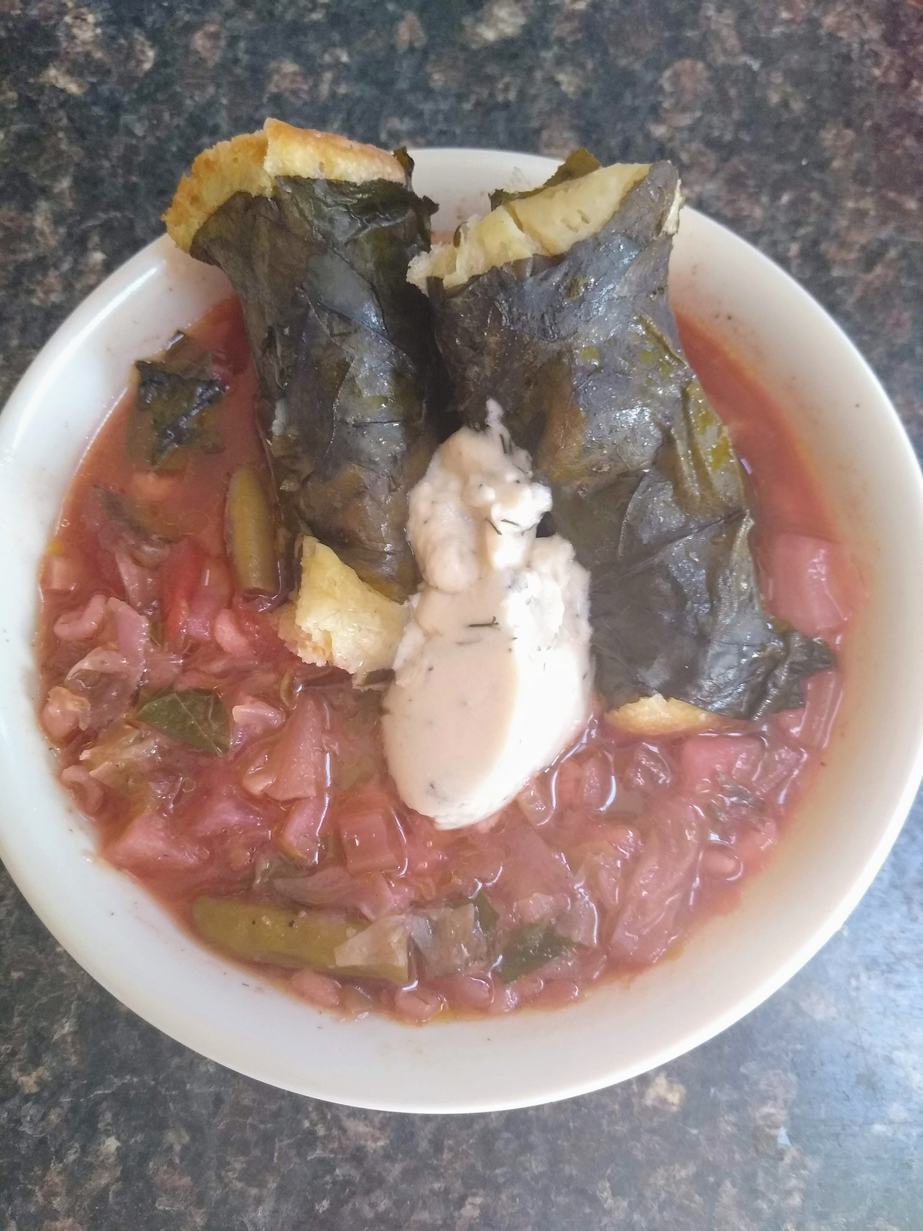 When the hubby mentioned beet leaves, I remembered seeing a recipe in a Facebook group about dumplings wrapped in beet leaves. I thought it would be the perfect accompaniment for borscht. I checked Pinterest and found this recipe for Ukrainian Beet Leaf Rolls with Creamy Dill Sauce