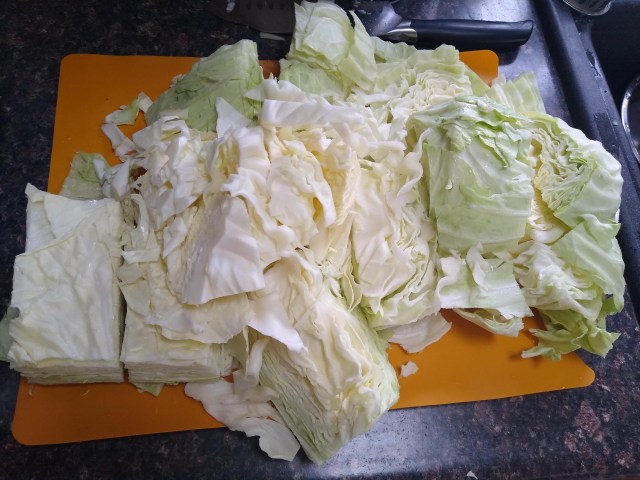 So, the borscht used up one small head of cabbage. What do I do with the other ones? I freeze a few whole, wrapped in saran wrap and then foil. When I want to make pigs in the blanket (hamburger-rice dressing wrapped in cabbage leaves, and baked in a tomato sauce), I take it out to thaw and the leaves are nice and soft without the mess of boiling the cabbage. That still leaves me with three heads to ferment for sauerkraut.