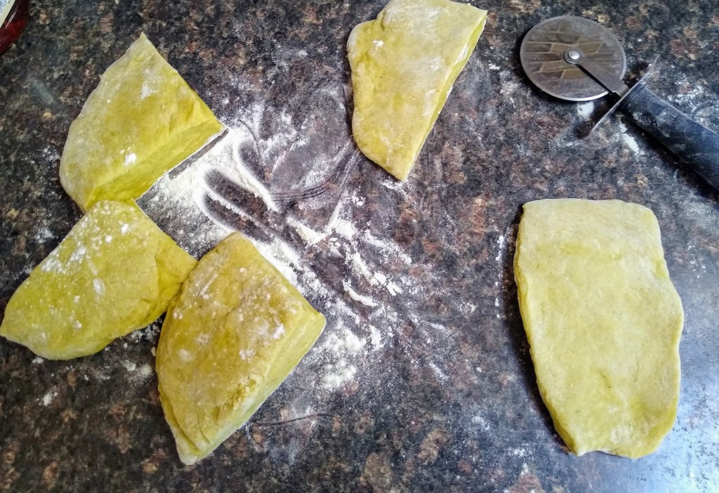 Dump it onto a floured surface, pull it all together, and knead it for a few minutes. Wrap it in saran wrap and set aside about 30 minutes to rest. This is time enough to make the next batch.