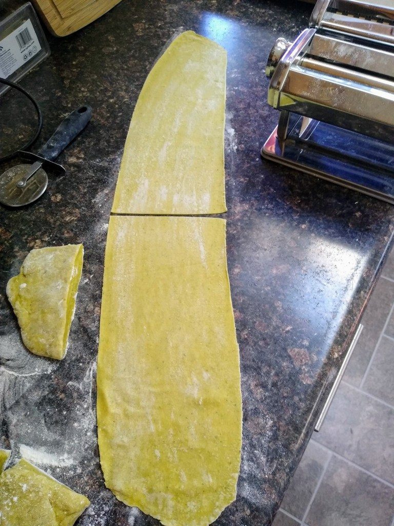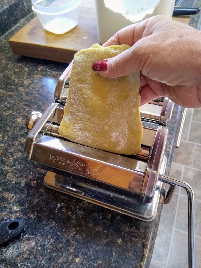 Now it’s time to make the pasta. I have a pretty basic manual pasta maker that cost about $25 a few years ago. It came with the basic attachment for angel hair and fettuccine noodles, but I also purchased a lasagna attachment. Some have electric machines or attachments for their Kitchen Aid mixers. Use what you have or can afford. I’ve also made it using a rolling pin and pizza cutter, so no need for any special equipment at all. A wine bottle can also serve as a rolling pin. Ask me how I know this. 🙂