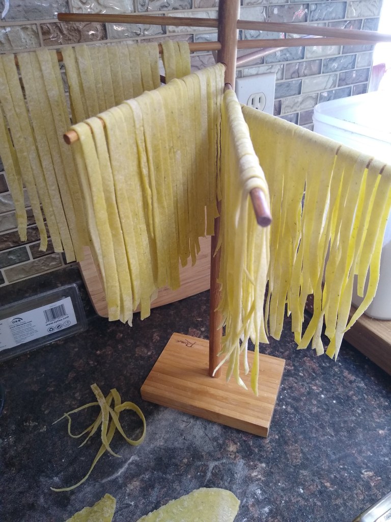 As you get them cut, hang them to dry overnight. I bought a couple of pasta drying racks, but you can also use a coat hanger or spread them on a dishtowel.