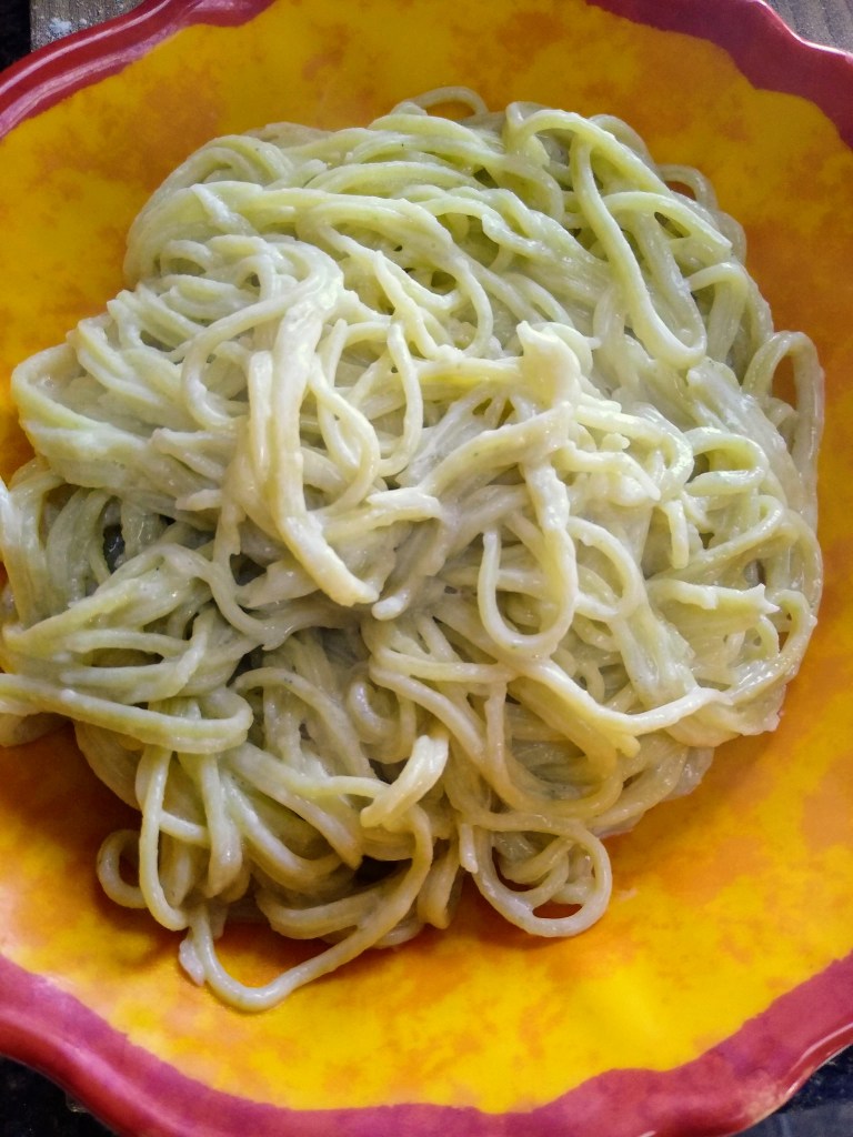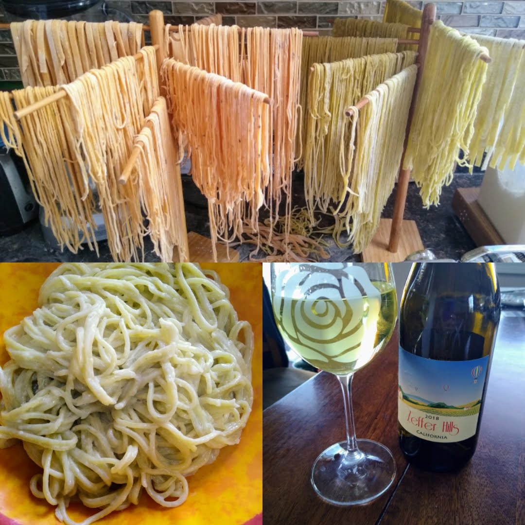 I couldn’t resist. I made some immediately for dinner. I made the garlic basil angel hair and after draining, I made a quick sauce of butter, half and half, and Parmesan. It was perfect, especially paired with a Chardonnay.