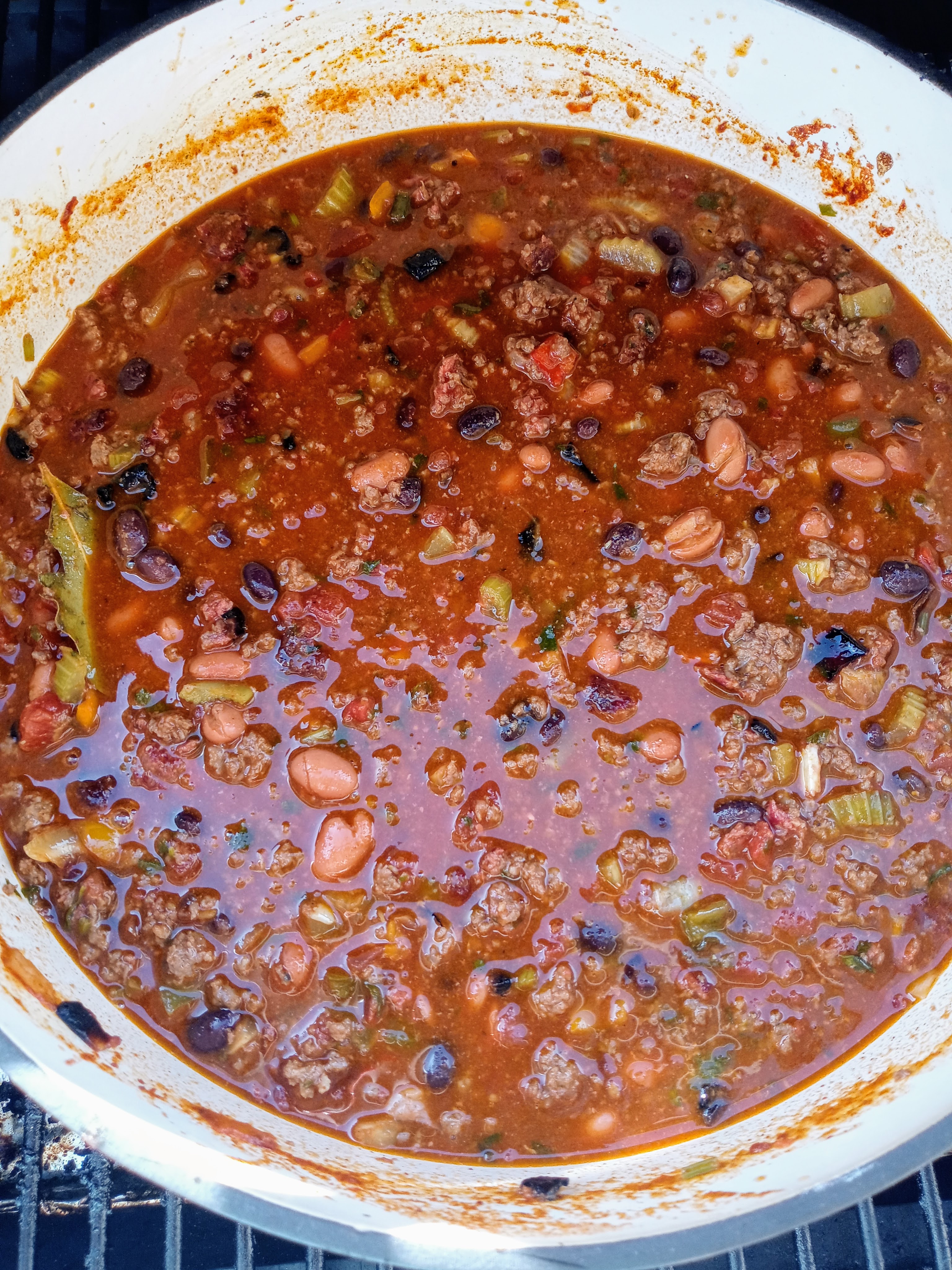 When the internal temp of the meat reaches 150, put it into the pot and break it up. Add the rest of the veggies if you didn’t do it earlier. Add the beans and a couple more cups of liquid. I used one can of chili beans and one can of drained, rinsed black beans. Use a can or two of your favorite or leave them out if you like. I used water for the liquid this time. Give it a stir and return to the grill to simmer for at least half an hour to let the flavors blend.