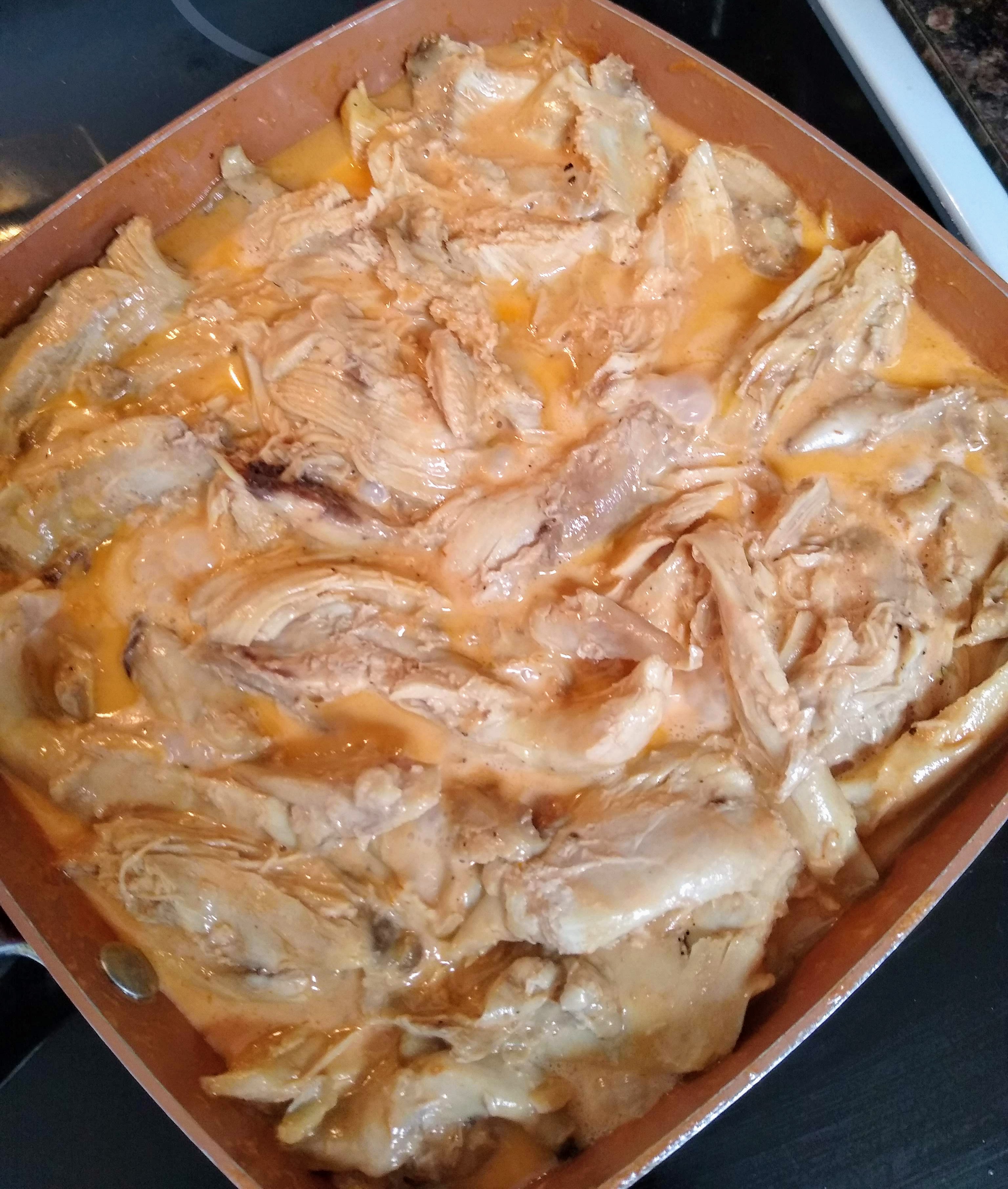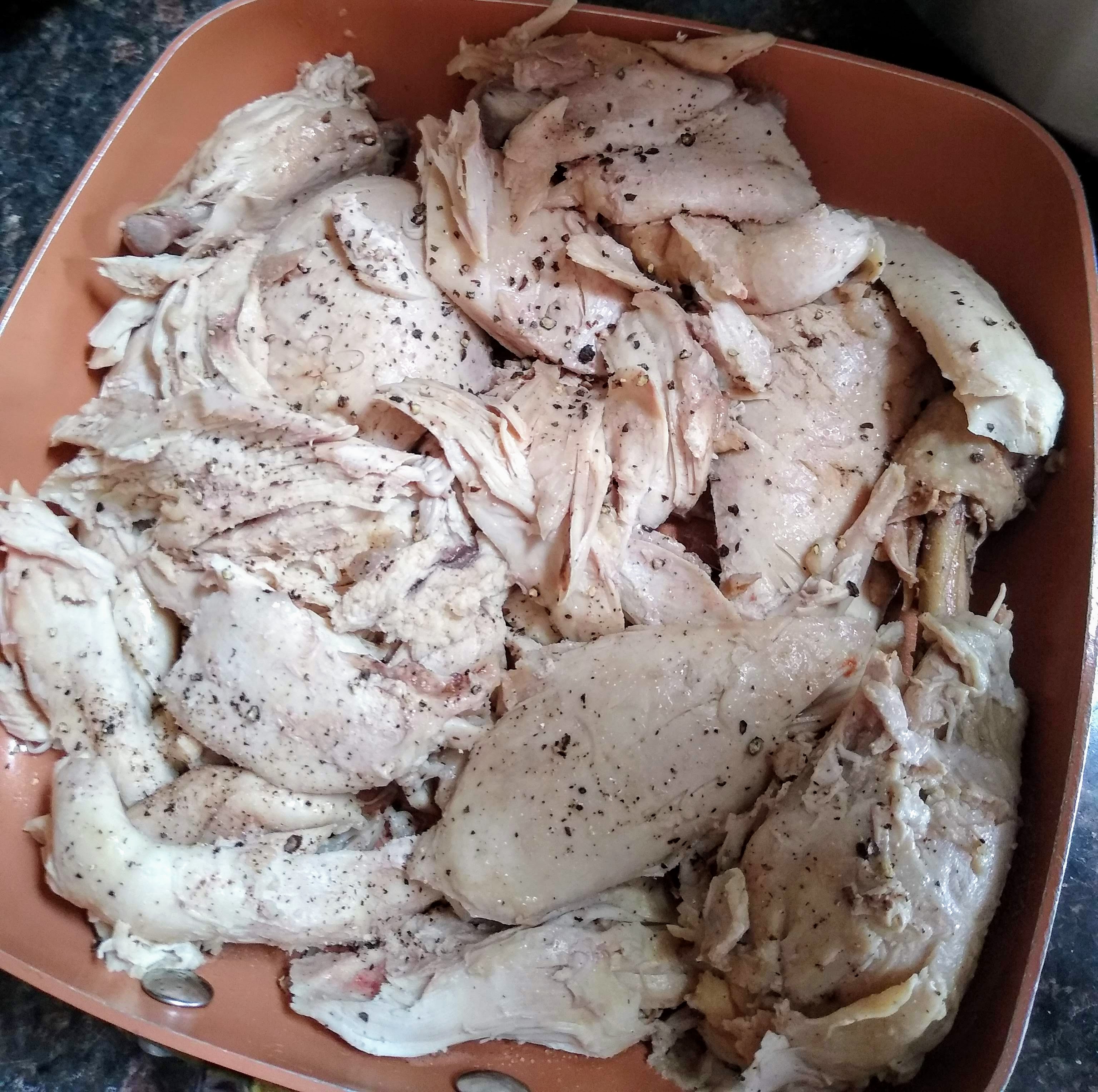 At this point I skin and debone the chicken. I put the tiny pieces from the back, ribs, neck, and wings back into the soup. I cut the breast meat into several smaller pieces so it can soak up more dungas! I also reseason the chicken with salt and pepper. Pour a mixture of about 3/4 heavy cream, 1/4 ketchup, and a Tbsp or two brown sugar over the chicken. (Don’t judge – it’s comfort food, not health food!) I only made a little cream sauce this time. You can make more and serve it over mashed potatoes or make just enough to flavor and moisten the chicken and soak up with some bread. Simmer the cream chicken over low heat, stirring occasionally until the soup is done.