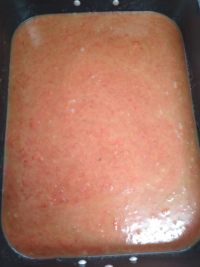 I warmed the caramel a little to make it more pourable (I think I just made up that word), and mixed it in the bottom of a large (12 1/2 x 16 1/2 in.) roasting pan with two heaping cups of the rhubarb sauce.