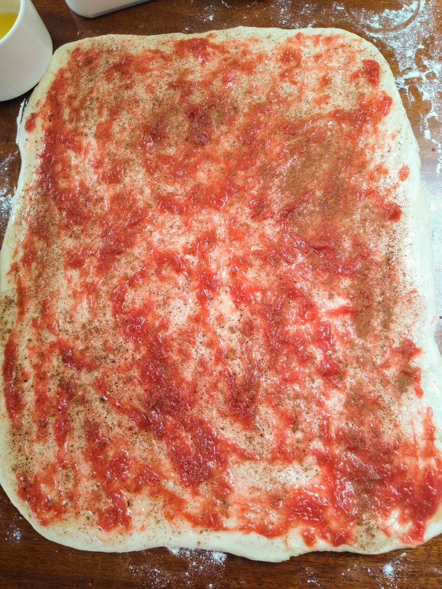 Roll out the dough into about a 12×18 rectangle, spread with melted butter, then with about a cup of the rhubarb sauce, and sprinkle with cinnamon. Note: Here is another point in the recipe you could add more sugar by sprinkling a cinnamon/sugar mixture, rather than just cinnamon.