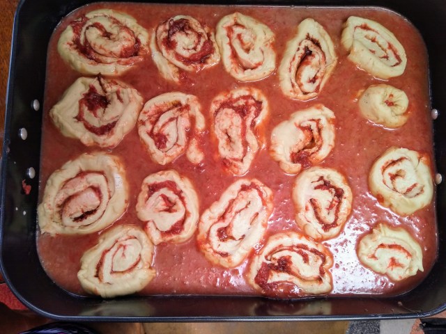 Roll up the dough, slice into one-inch pieces and place in the rhubarb caramel sauce. Cover with a dishtowel and put somewhere warm and draft-free for up to two hours.
