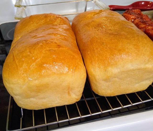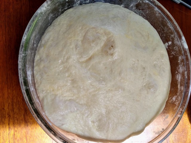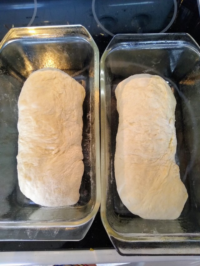 While the rolls were rising I decided to use the time productively and bake bread as well. Thanks to the pandemic, I could not find flour or yeast in stores in Arizona, even up until mid-May, unless I got up at the crack of dawn, waited in line, and did this repeatedly, hoping to get lucky (my, how the meaning of that phrase has changed!). I decided to avoid that hassle and elevated my grandma street cred by using Amazon Prime to purchase a 50 lb. bag of flour and a pound of yeast. I froze the flour in one gallon ziplock bags and brought a few of them back to ND with me, along with a pint jar of yeast. I still had a jar of yeast in the refrigerator from last summer that had expired a couple of months ago. I didn’t want to chance making bread with it, so I dissolved some of that in a bowl of water and did another bowl with my new stuff to compare. They both got nice and bubbly, so I figured I may as well bake something with the extra batch.