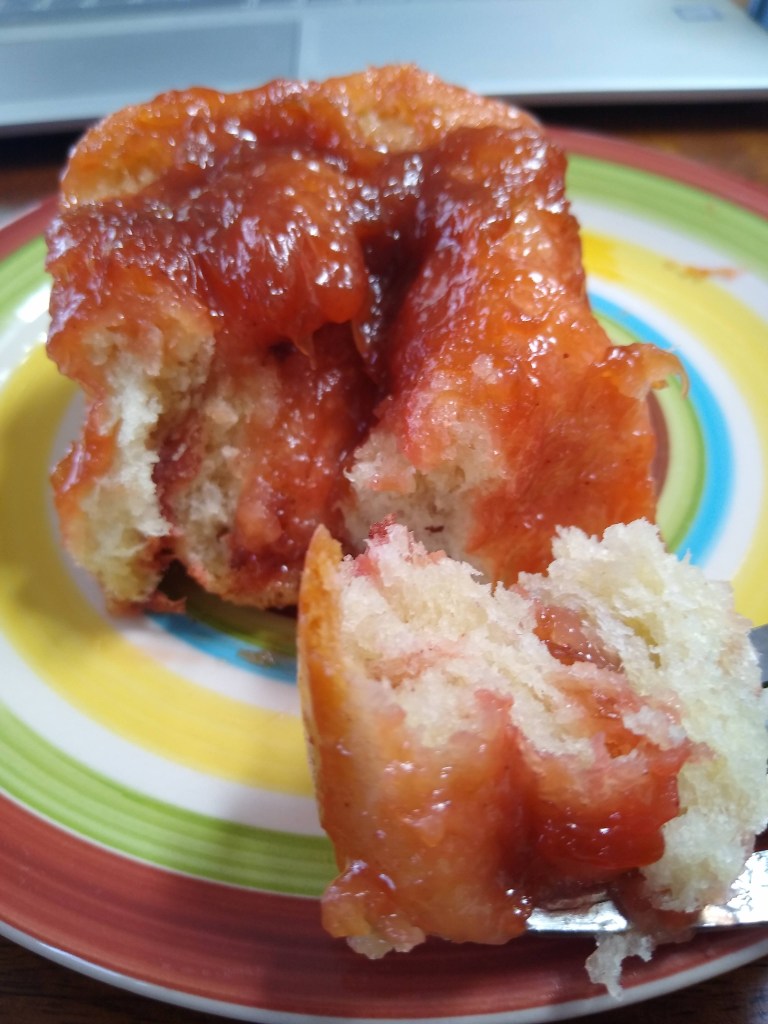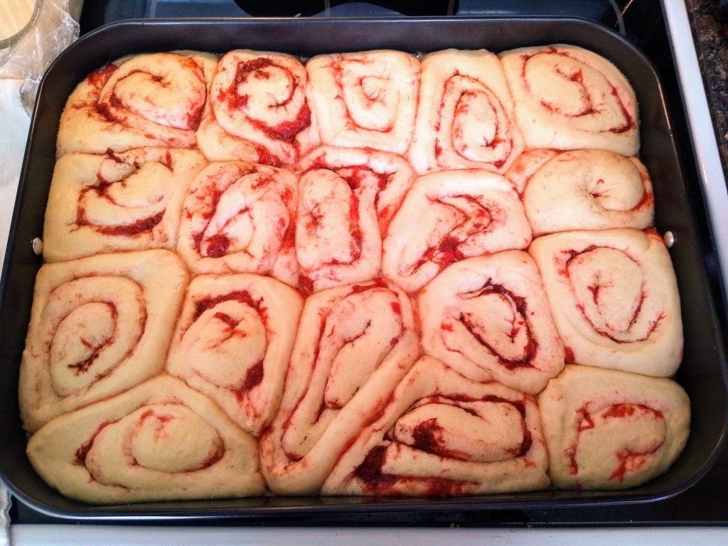 I have kind of a like/hate relationship with rhubarb. For most of my life I hated it and have now gotten to the point where I like it – if it’s tempered with strawberries, or at least strawberry flavor. In my opinion, it’s just too tart to be palatable unless it’s in a recipe loaded with sugar, which I’m also not fond of in large quantities. In the case of this recipe, the tartness of the rhubarb is mellowed by the caramel, and I make the rhubarb sauce with strawberry jello – a win win for me. These rolls still have a tartness to them, so I pointed out a few places where more sugar can be added.