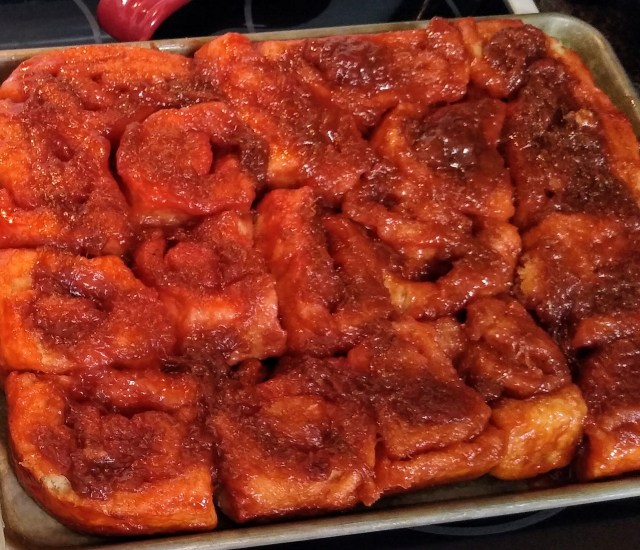 Bake at 375 for 35 minutes. Remove from the oven and carefully flip over onto a cookie sheet, scraping out all the caramel sauce and spreading on top of the rolls.