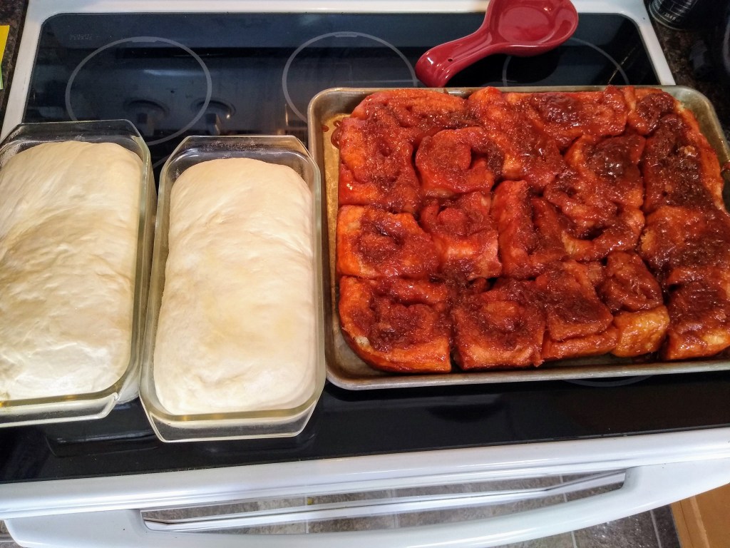 Rhubarb caramel rolls done and bread ready to go in