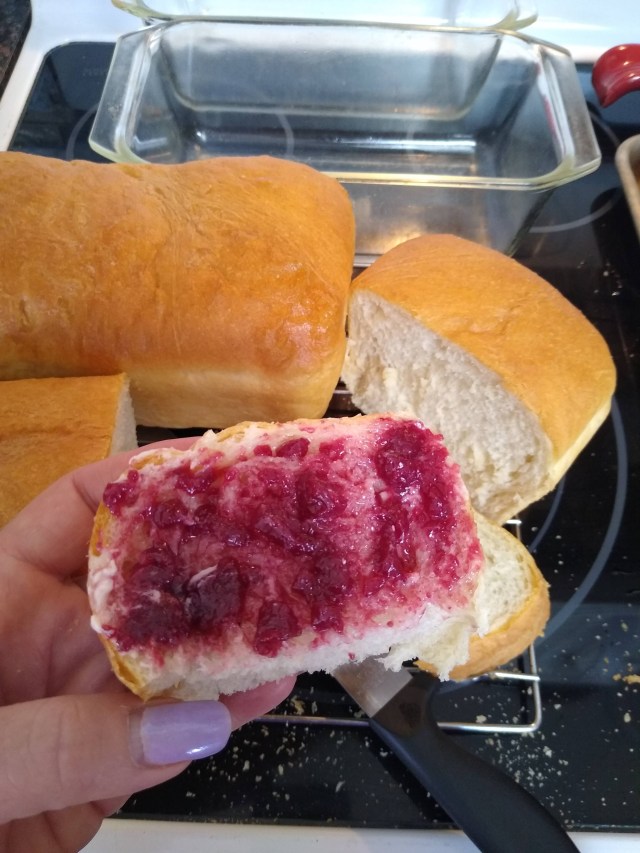 I used this recipe from Plated Cravings, and again, where it calls for 2 1/4 tsp yeast, which is a packet, I uses a Tbs. It turned out fabulous! It makes two loaves, one to devour right away with homemade chokecherry jelly and one to share or freeze. With no preservatives, this bread does not stay fresh long. If you freeze it, wrap it tightly with Saran Wrap and then put it in a ziplock freezer bag. When you thaw and warm it slightly, it will be just as good as freshly baked.
